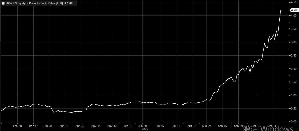 从估值上看,闪迪的市净率超过4.2倍,由于上市时间较短,现在是历史上最高的估值: