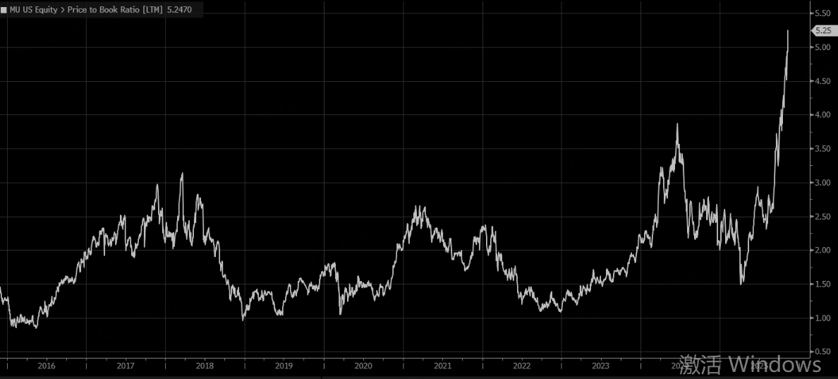 横向对比美光,当前的市净率估值为5.25倍,大幅超过此前存储牛市时3倍左右的估值高峰: