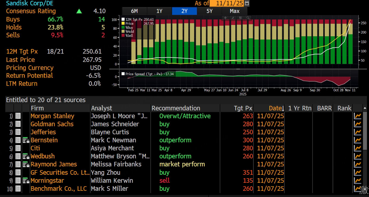 但从分析师给出的目标价来看,闪迪在280美元左右,现价268: