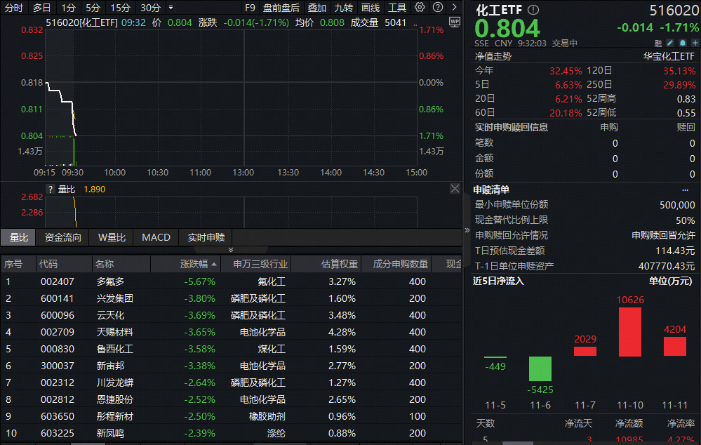 成份股方面,氟化工、磷化工、锂电、煤化工等板块部分个股跌幅居前。截至发稿,多氟多大跌超5%,兴发集团、云天化、天赐材料、鲁西化工等多股跌超3%,拖累板块走势。