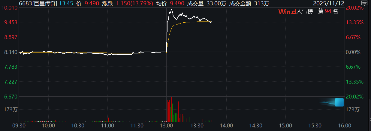 11月12日,港股巨星传奇午后开盘直线拉升,一度涨超20%,截止发稿涨13.79%,报9.49港元。