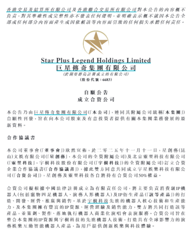 消息面上,今日午间,巨星传奇在港交所公告,11日公司全资附属公司星创艺(昆山)文娱有限公司及北京灵翌科技有限公司(宇树科技股份有限公司的全资附属公司)订立合资企业合作协议书,双方同意共同成立宇星娱乐科技有限公司,星创艺及灵翌科技各自将持有合资公司50%权益。