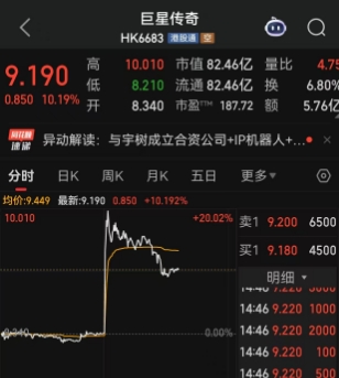 受此消息刺激,原本走势平平无奇的巨星传奇股价午后直线拉升,一度涨超20%,最高报10.01港元/股,随后股价出现回落,截至发稿报9.19港元/股,上涨20%。