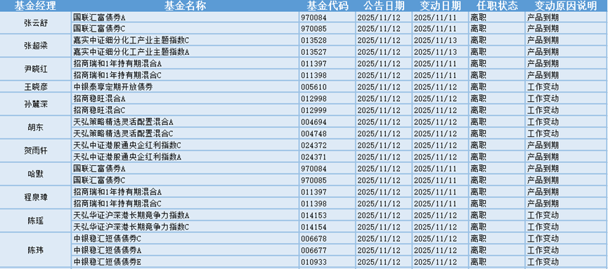 根据巨灵统计的数据显示,近30天(10.13-11.12)共有572只基金产品的基金经理发生离职变动。其中今天(11.12)有22只基金产品发布基金经理离职公告,从变动原因上来看,有5位基金经理是由于工作变动而从管理的10只基金产品中离职,有6位基金经理是由于产品到期而从管理的12只基金产品中离职。