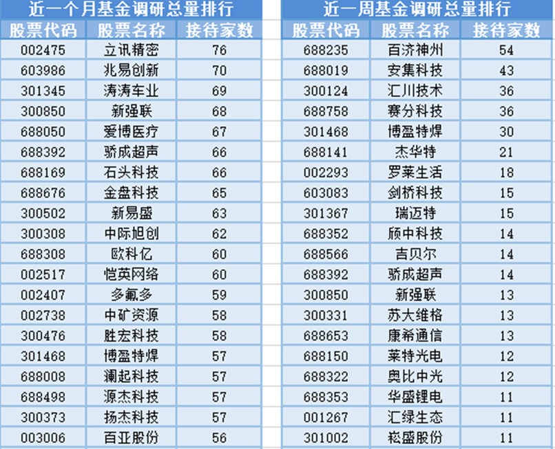 从个股调研情况上来看,最近1个月(10月13日-11月12日)最受公募基金关注的是立讯精密,属于消费电子行业,主营业务为从事消费电子、通信及数据中心、汽车、医疗等领域相关零组件、模组及系统集成业务。共有76家基金管理公司参与调研,其次是兆易创新和涛涛车业,分别接受70家、69家基金管理公司的调研。