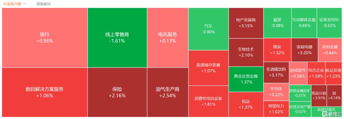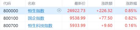 港股三大指数集体收涨,恒生指数、国企指数盘中一度冲高至1.2%,恒指更是一度站上27000点大关,最终分别收涨0.85%及0.82%,恒生科技指数表现相对较弱,小幅上涨0.16%。