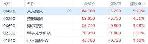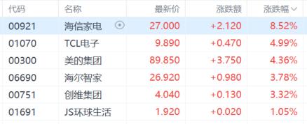 家电股齐涨,海信家电涨超8%,TCL电子、美的集团涨超4%,海尔智家、创维集团等跟涨。