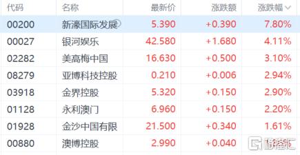 濠赌股走高,新濠国际发展涨超7%,银河娱乐涨超4%,美高梅中国涨超3%,金界控股、永利澳门等跟涨。