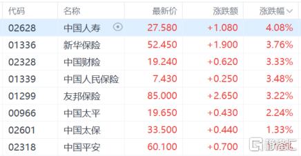 保险股走强,中国人寿涨超4%,新华保险、中国财险、中国人民保险、友邦保险涨超3%,中国太平、中国太保等跟涨。