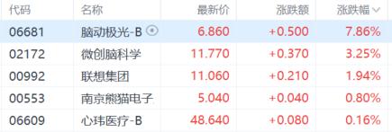 脑机接口概念股走强,脑动极光-B涨超7%,微创脑科学涨超3%,联想集团、南京熊猫电子股份等跟涨。