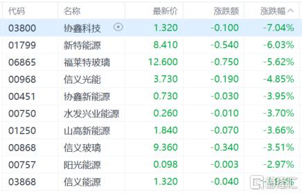 光伏大跌,协鑫科技跌超7%,新特能源跌超6%,福莱特玻璃跌超5%,信义光能跌超4%,山高新能源、信义玻璃等跟跌。