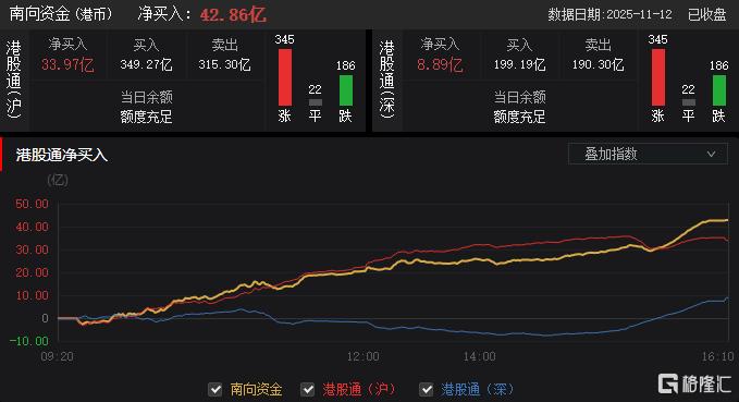 今日,南向资金净买入42.86亿港元,其中港股通(沪)净买入33.97亿港元,港股通(深)净买入8.89亿港元。