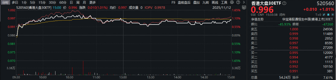 核心ETF方面,港股通“科技+红利”双核配置工具——香港大盘30ETF(520560)今日量价齐升,全天高位震荡,收盘涨超1%,成交额超5400万元,较昨日显著放量!收盘同时站上所有短期均线,技术面形成放量突破形态,短线多头概率显著提升,若未来两个交易日继续站稳20日线且量能维持高位,或有望确认新一轮短多行情,适合作为港股反弹阶段的核心配置标的。
