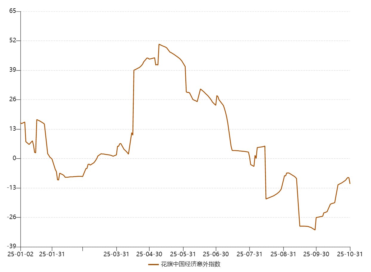 另两大基础因子如何呢?一个是流动性因子,一个是通货膨胀因子。从流动性来看,美联储降息后我们并没有跟随,十年期国债收益率略有抬升,但变化不大。支持中国资产重估的人民币兑美元并未出现明显的升值,十五五规划也明确了人民币汇率要保持稳定。从这个因子看,风险资产的定价模型提示我们要谨慎为之。反而从较好反映风险溢价的花旗意外指数看,中国风险资产的定价支持力度比过去一个月要强,这是否意味着投资者又在期待政策的进一步刺激呢?