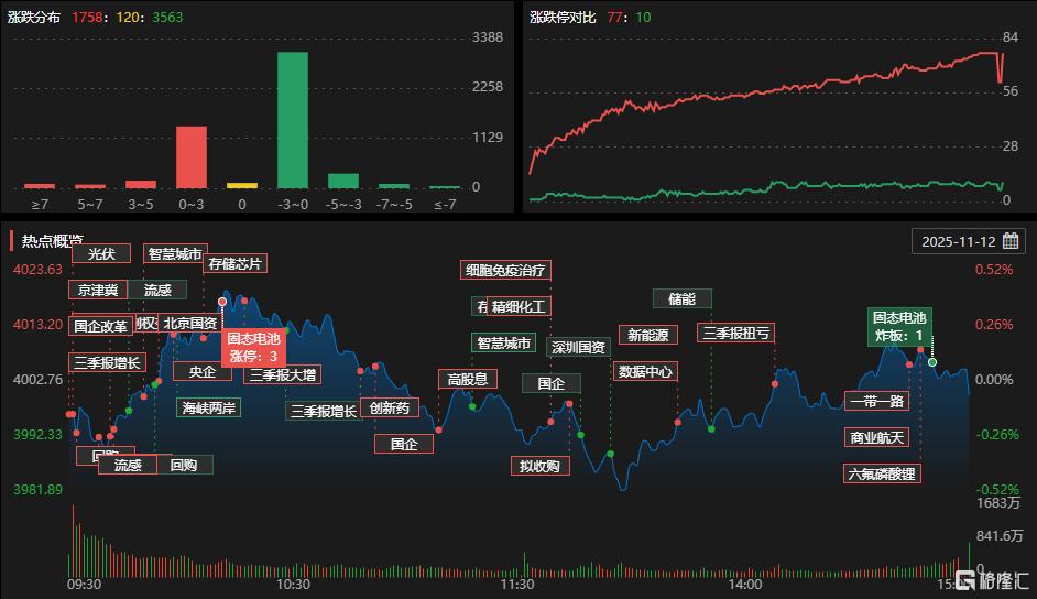 11月12日,沪深两市成交额1.95万亿元,较上一个交易日缩量486亿元。板块方面,保险、医药、油气、脑机接口等板块涨幅居前,培育钻石、光伏、BC电池、风电设备、可控核聚变等板块跌幅居前。