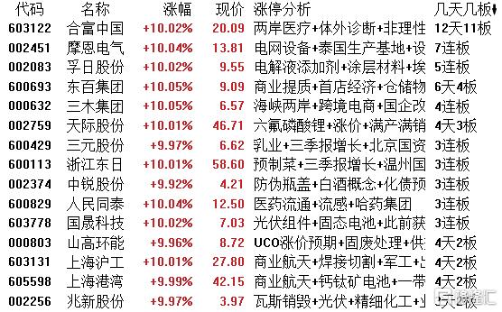 高位股方面,医药商业板块合富中国12天11板,电网设备股摩恩电气7连板,锂电池板块孚日股份5连板,东百集团6天4板,三木集团4连板,天际股份4天3板,三元股份等3连板。