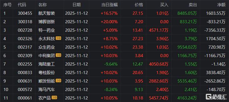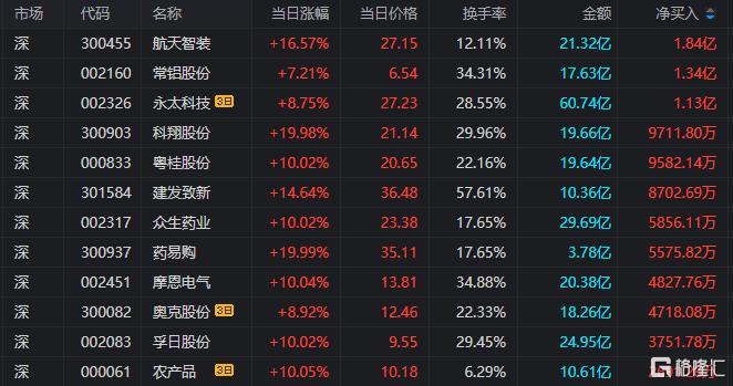 龙虎榜单日净买入额前三为航天智装、常铝股份、科翔股份,分别为1.84亿元、1.34亿元、9711.80万元。