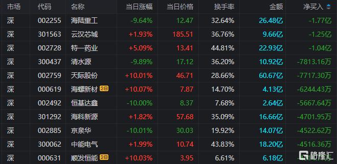海陆重工:今日下跌9.64%,全天换手率32.64%,成交额26.48亿元。深股通净卖出1.14亿元,营业部席位合计净卖出6338.41万元。