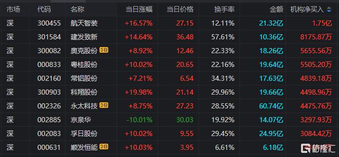 龙虎榜中涉及机构专用席位的个股中,当日净买入额前三为航天智装、建发致新、粤桂股份,分别为1.75亿元、8175.87万元、5505.20万元。
