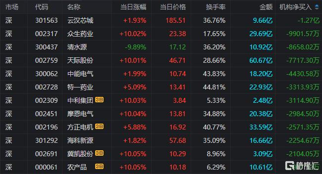 龙虎榜中涉及机构专用席位的个股中,当日净卖出额前三为云汉芯城、众生药业、清水源,分别为1.27亿元、9901.57万元、8658.02万元。