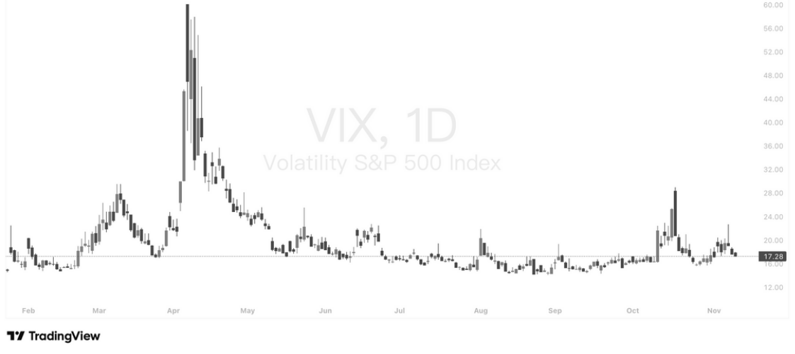 恐慌指数(VIX)在经历10月底的短暂上冲后,近日持续回落至17附近,逼近过去两个月的低位区间。整体波动率水平趋稳,显示市场情绪逐渐恢复平静,投资者对系统性风险的担忧有所减弱。当前VIX走势维持在16–20区间震荡,若能持续稳定在17下方,将为股市反弹提供支撑;但若未来受宏观或政策风险驱动再度上破20,则可能引发短期避险情绪升温。总体来看,当前波动环境偏向温和,有利于风险资产延续反弹趋势。