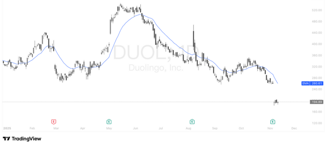 DUOL自年中高点持续下行,整体仍处于中期下降趋势通道内,目前股价在190美元附近企稳,出现初步止跌迹象。短期价格远低于20日EMA(260.6),显示上方仍有较大反压,但下行速度已明显放缓。近期成交量萎缩,说明抛压逐渐减弱,短线资金在低位尝试承接。若股价能稳定于190美元上方并收复210美元,则可能形成反弹确认区间,上方第一压力位在230美元,进一步突破则有望测试260美元EMA均线。