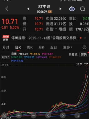 11月12日晚间,连续19个交易日涨停的ST中迪公告表示,为维护投资者利益,公司将就股票交易波动情况进行核查。公司股票自2025年11月13日开市起停牌,待核查结束并披露相关公告后复牌,预计停牌时间不超过3个交易日。