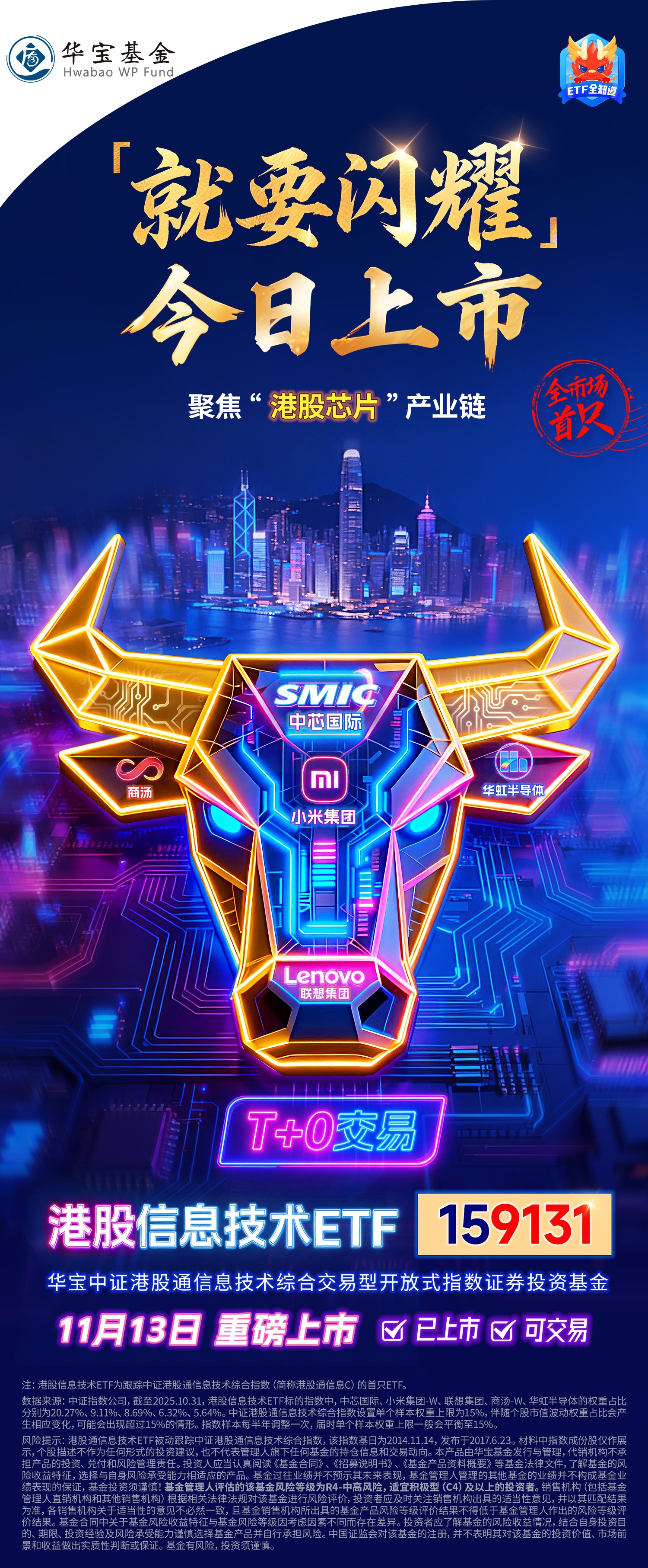 中国半导体行业上市公司最新披露的三季报业绩迎来强劲爆发。Wind数据显示,剔除尚未披露业绩的中芯国际、华虹公司,今年前三季度申万半导体行业上市公司营业收入合计达4392亿元,归母净利润合计达398亿元,同比上年可比口径分别增长近14%和约53%。10月28日公布的“十五五”规划建议全文强调,采取超常规措施,全链条推动集成电路、工业母机、高端仪器、基础软件、先进材料、生物制造等重点领域关键核心技术攻关取得决定性突破;明确推动量子科技、生物制造、氢能和核聚变能、脑机接口、具身智能、第六代移动通信等成为新的经济增长点;要求全面实施“人工智能+”行动,抢占人工智能产业应用制高点,全方位赋能千行百业。相关表述将中国芯片产业成长空间强力推升到了“决定性突破”的新高度。千亿规模ETF大厂——华宝基金旗下全市场首只聚焦“港股芯片”产业链的港股信息技术ETF(159131)今日(11月13日)澎湃上市,该基金为全市场首只跟踪中证港股通信息技术综合指数(简称“港股通信息C”)的ETF,其标的指数由属于信息技术产业的42只港股硬科技公司构成成份股组合,将为投资者参与把握港股“中国硬科技资产”投资机遇提供又一创新ETF工具。据2025年基金季报统计,2025年前三季度,华宝基金旗下所有ETF(含货币型)利润合计168.95亿元,其中股票ETF利润合计高达162.61亿元。