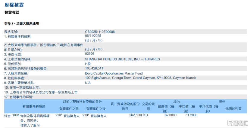 11月6日与11月10日,博裕资本(Boyu Capital Investment Management Limited)接连出手,分别买入复宏汉霖262,500股及80,000股H股,两次增持后其H股好仓比例由5.84%跃升至7%。