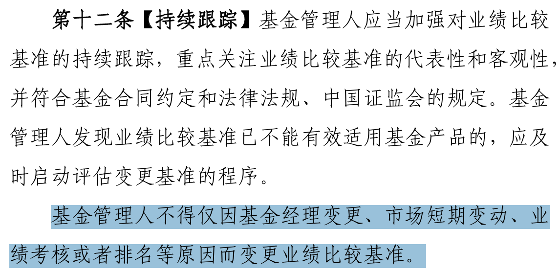 此外,为防止基金管理人通过频繁变更基准来掩盖投资失误,《指引》明确禁止仅因基金经理变更、市场短期变动、业绩考核或排名等原因变更基准。业绩基准确需变更的,必须履行相应的程序和披露义务。