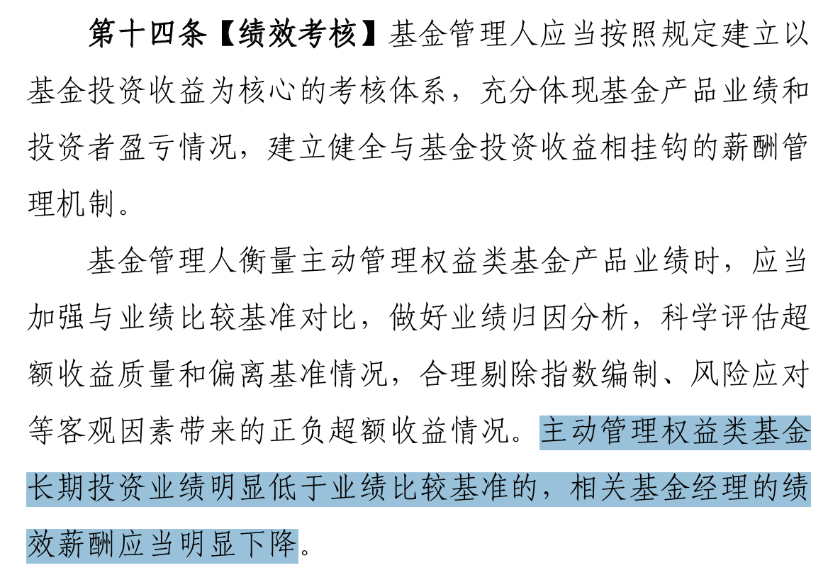 《指引》提出,基金管理人应当按照规定建立以基金投资收益为核心的考核体系,充分体现基金产品业绩和投资者盈亏情况,建立健全与基金投资收益相挂钩的薪酬管理机制。主动管理权益类基金长期投资业绩明显低于业绩比较基准的,相关基金经理的绩效薪酬应当明显下降。
