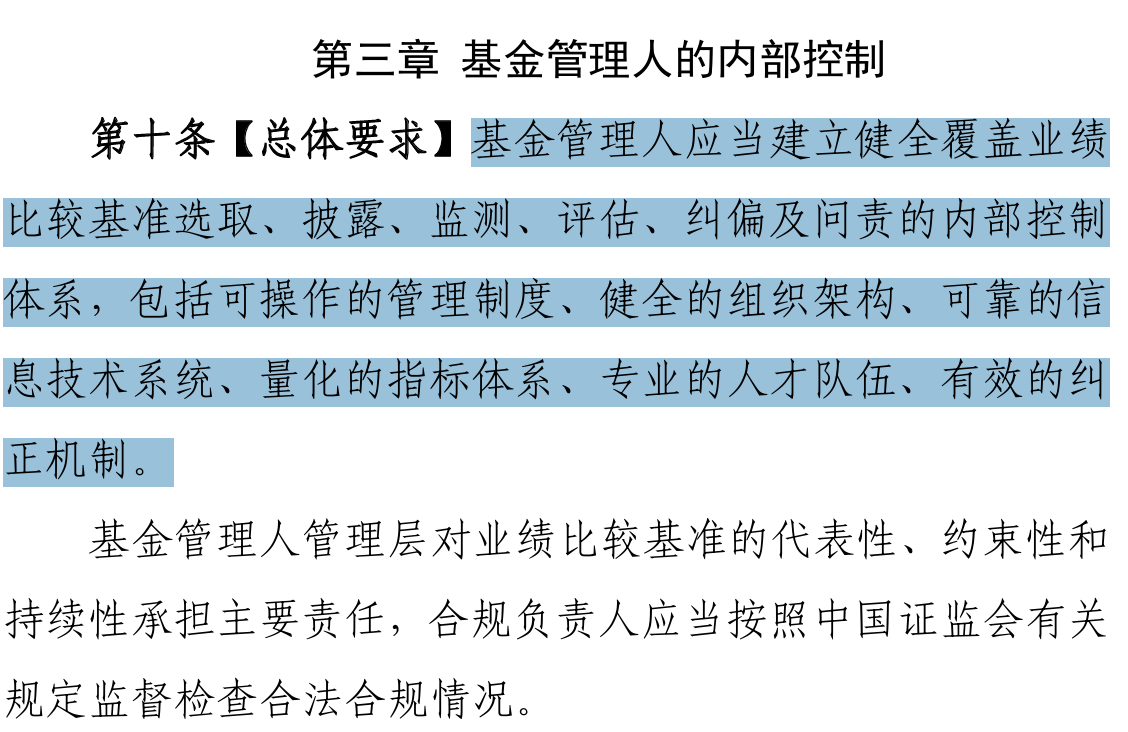 根据《指引》基金管理人应当建立健全覆盖业绩比较基准选取、披露、监测、评估、纠偏及问责的内部控制体系,包括可操作的管理制度、健全的组织架构、可靠的信息技术系统、量化的指标体系、专业的人才队伍、有效的纠正机制。