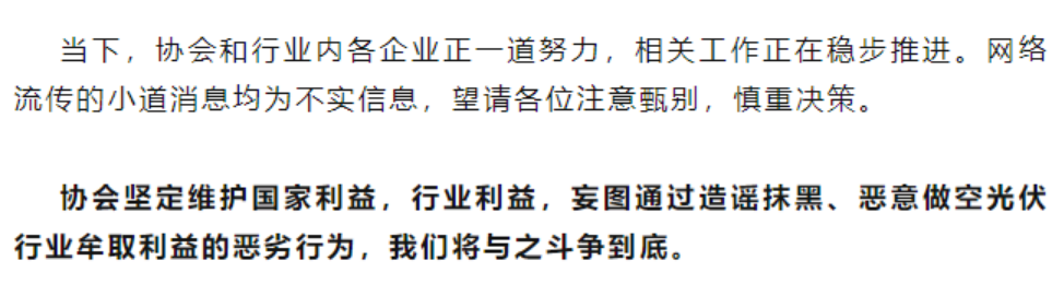 同日,中国光伏行业协会也发布声明,强调“网传相关小道消息均为不实信息”。协会在相关部委指导下,正积极推进光伏行业自律与“反内卷”工作,从供需两端协同发力,以市场化、法治化方式推动行业健康发展。目前,相关工作正稳步推进中。协会在声明中特别指出:“对于妄图通过造谣抹黑、恶意做空光伏行业牟取利益的恶劣行为,我们将坚决予以斗争。”
