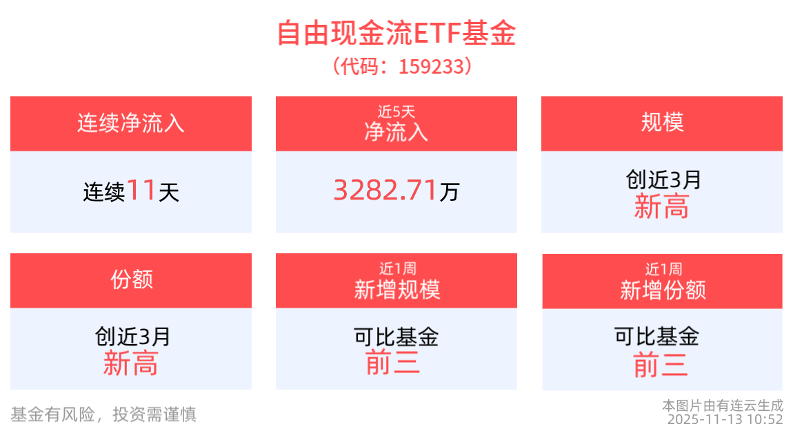 规模方面,自由现金流ETF基金最新规模达4.53亿元,创近3月新高。
