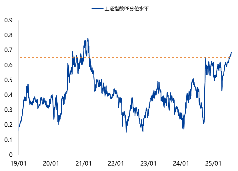 随着指数不断向上突破,市场做多情绪得到强化,融资资金和陆股通资金成交占比明显回升,赚钱效应推动增量资金入场,沪深两市成交额稳步提升。与此同时,股市市盈率开始向上突破去年924行情以来的67%估值高位,当前估值水平已接近历史70%分位。