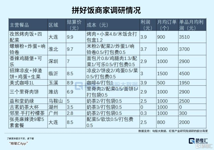 例如,根据媒体报道,在河北石家庄,“幸福大锅菜”老板史建龙上线拼好饭后,他的“标准大锅菜+馒头2个+自制泡菜”套餐以6.9元的价格售卖,拼好饭渠道每月卖出5000单左右。