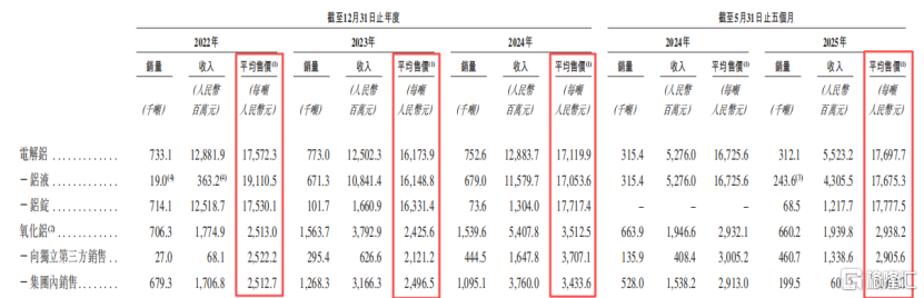 氧化铝的收入贡献也受到平均市价的波动影响。报告期内,CRU中国氧化铝价格分别为2936元/每吨、2906元/每吨、4030元/每吨、3517元/每吨。