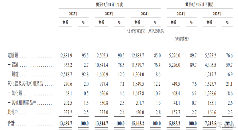 从产品收入结构来看,2022年至2025年1-5月,电解铝的销售收入占比由95.5%下降至76.6%。
