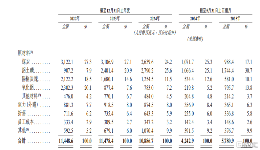 此外,铝土矿也是重要的原材料。2022年至2025年1-5月,铝土矿的成本占比由7.9%提高至30.7%。
