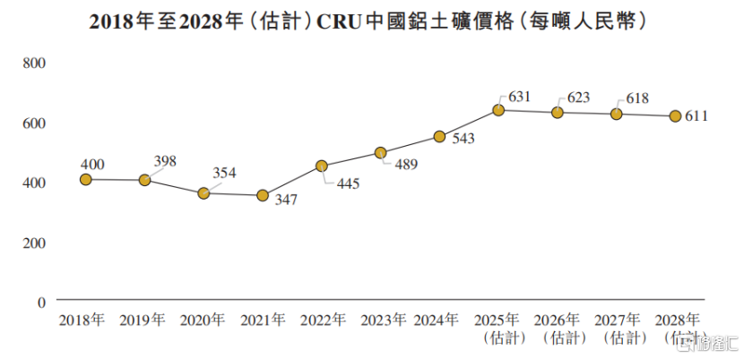 由于增加使用从海外进口的铝土矿,招股书中预测,2028年,CRU中国铝土矿价格将大幅上涨至约611元/每吨。