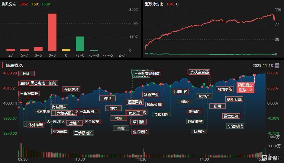 11月13日,A股三大指数低开高走,沪指涨0.73%报4029点续创十年新高,深证成指涨1.78%,创业板指涨2.55%,全市场超3900股上涨,逾百股涨停。市场热点聚焦锂矿概念、锂电池产业链。