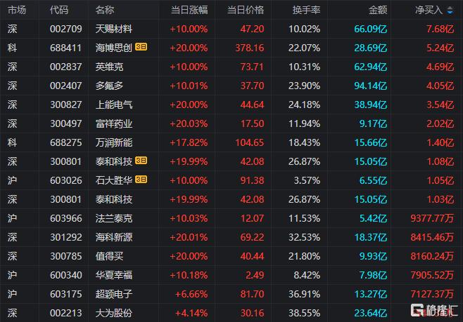 龙虎榜单日净买入额前三为天赐材料、英维克、多氟多,分别为7.68亿元、4.69亿元、4.05亿元。