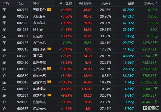 龙虎榜单日净卖出额前三为天际股份、永太科技、好上好,分别为3.80亿元、1.88亿元、1.59亿元。