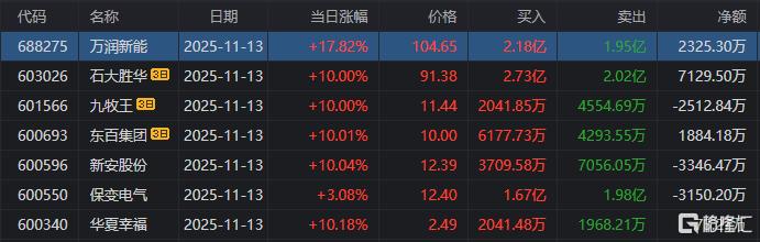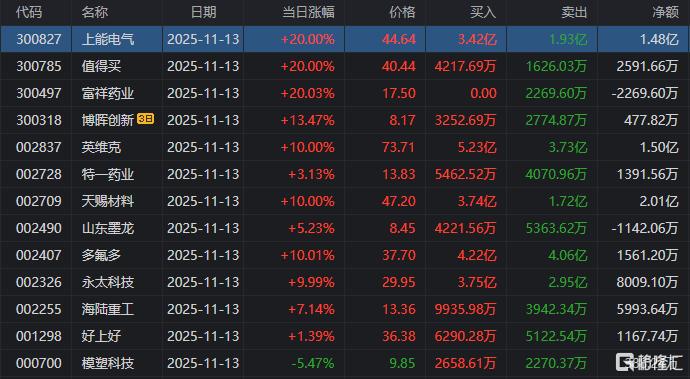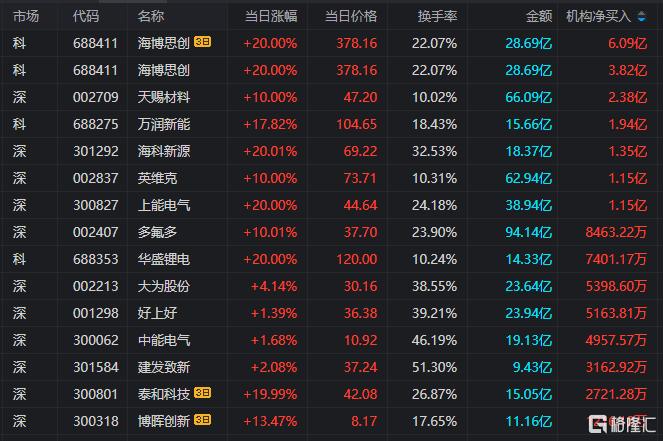 龙虎榜中涉及机构专用席位的个股中,当日净买入额前三为天赐材料、海科新源、英维克,分别为2.38亿元、1.35亿元、1.15亿元。