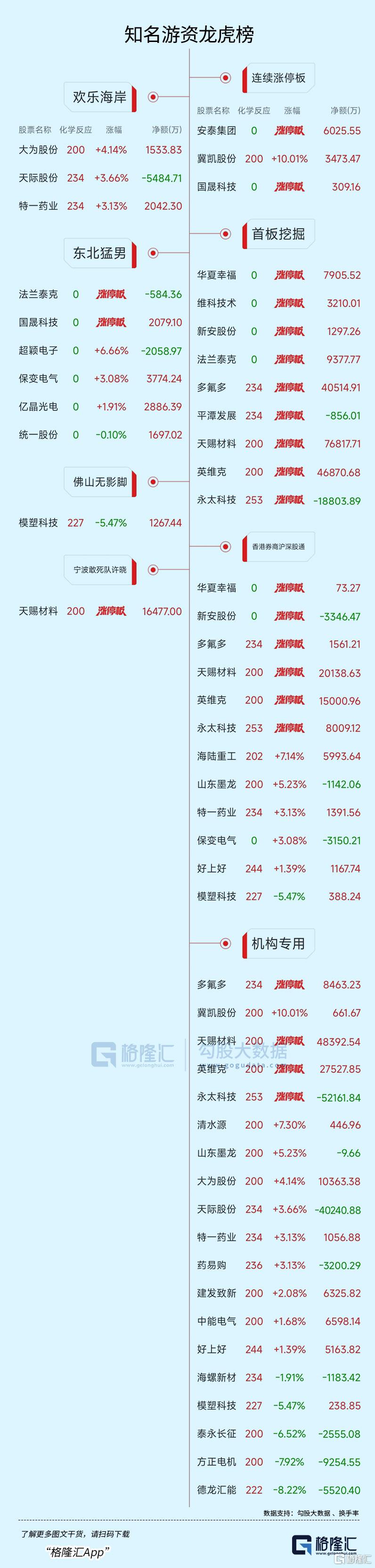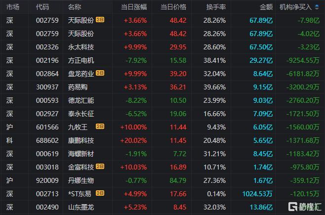 龙虎榜中涉及机构专用席位的个股中,当日净卖出额前三为天际股份、永太科技、方正电机,分别为4.02亿元、3.23亿元、9254.55万元。