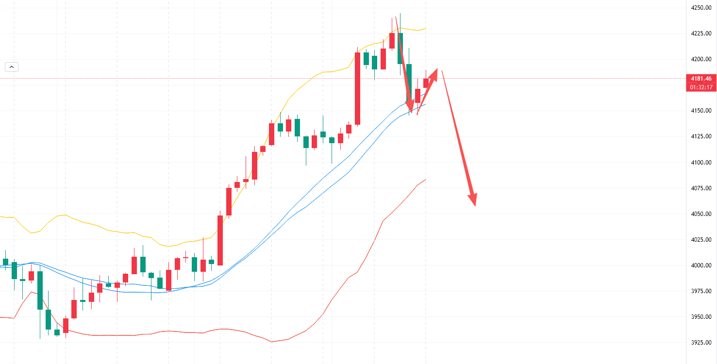昨日白盘延续上行走势,美盘行情突发转折,从4245一线直接承压下行,尾盘更是大幅跳水100美金,最终收于4145。我们昨日早盘思路中就提到4230-4240压制空,标题中也直接表明周四周五防回调。文章中更有清晰说明:大周期正处于二次探高确认阶段,多空转换期难免伴随反复冲高回落。之前也有说过突破趋势线4100上来后要去构筑次高结构。全网看涨我独空!一天的耐心终得回报。