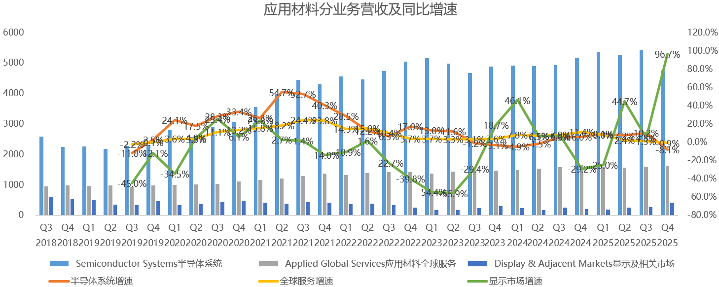 应用材料的收入主要来自设备销售,其次是零部件及软件维护等,25财年四季度,来自设备的收入达到47.6亿,同比下滑8.1%,主要是因美国出口管制政策,应用材料部分先进设备无法卖给中国客户;零部件及服务收入16.25亿,轻微下滑0.9%,主要是8英寸老旧设备销售下滑导致,而经常性零部件、软件及服务业务表现较好;显示及其他业务营收4.15亿,大幅超过管理层给出的3.5亿指引,同比大增96.7%: