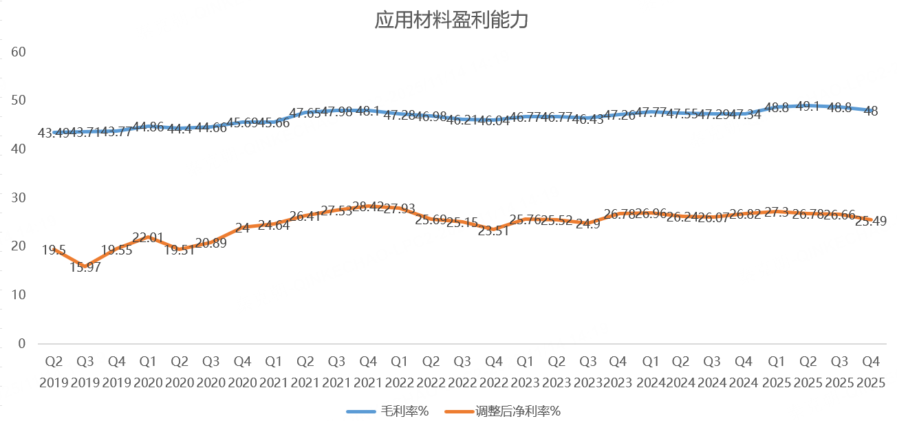 25财年四季度,应用材料毛利率为48%,较去年同期高了0.66个百分点,不过在管理及研发费用增加下,四季度营业利润有所下降:
