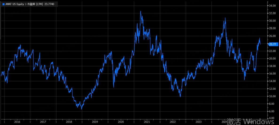 从市盈率估值上看,应用材料当前为24倍,较历史高点30倍的估值仍有空间: