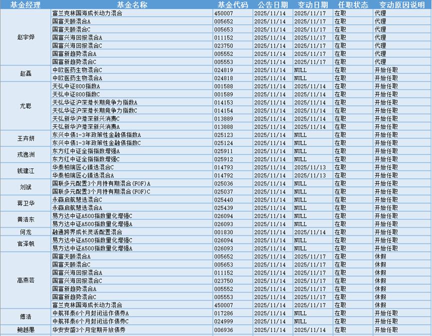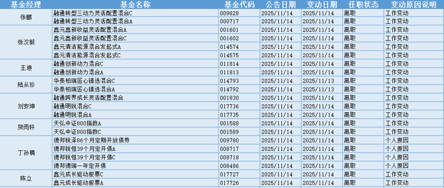 根据巨灵统计的数据显示,近30天(10.15-11.14)共有581只基金产品的基金经理发生离职变动。其中今天(11.14)有21只基金产品发布基金经理离职公告,从变动原因上来看,有7位基金经理是由于工作变动而从管理的17只基金产品中离职,有1位基金经理是由于个人原因而从管理的4只基金产品中离职。